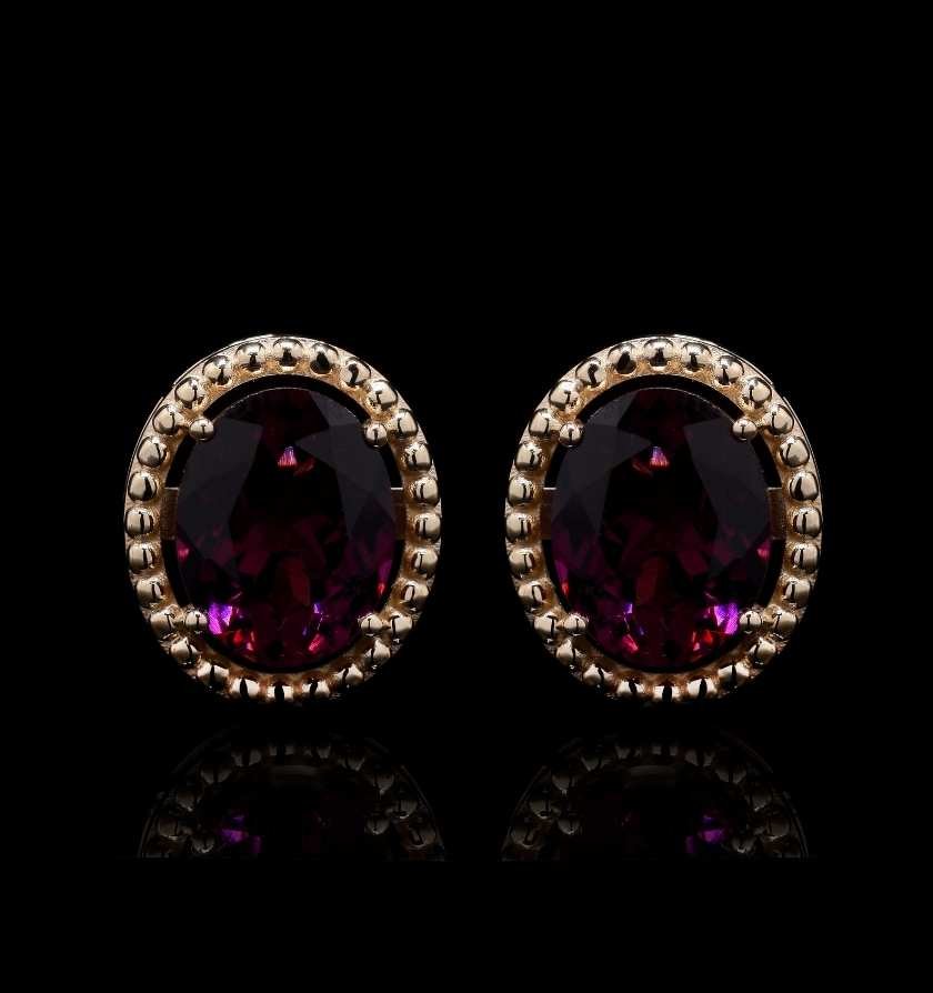 Elegant 14KT yellow gold earrings featuring rich rhodolite garnet—crafted to create a bold yet refined statement. The deep wine-red tones of the garnet add warmth and sophistication, making these earrings perfect for standout styling and special occasions.