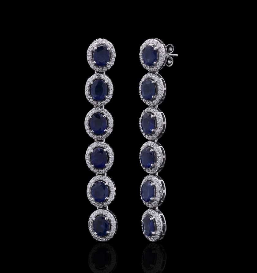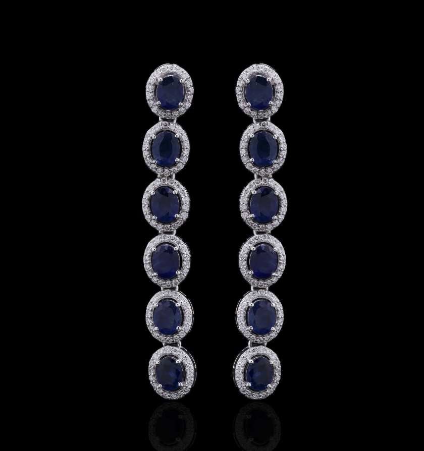 Graceful 14KT white gold earrings adorned with shimmering diamonds and rich blue sapphires—crafted to deliver a luxurious and timeless appeal. The brilliance of diamonds combined with deep sapphire tones creates a refined look, perfect for special occasions and elegant styling.