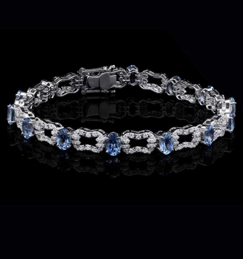 Premium 14KT white gold bracelet adorned with dazzling diamonds and serene aqua stone—crafted to create a refined and luxurious appeal. The calming blue tones of the aqua gemstone paired with brilliant diamond accents offer a sophisticated and elegant look, perfect for special occasions and upscale styling.