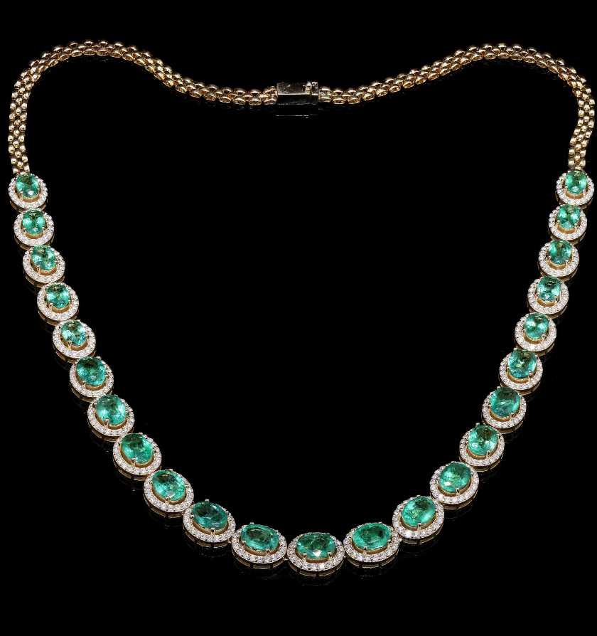 Magnificent 14KT yellow gold necklace adorned with dazzling diamonds and rich emerald stones—crafted to create an opulent and grand statement. The vibrant green emeralds paired with brilliant diamond accents form a luxurious masterpiece, perfect for elite occasions and high-end styling.